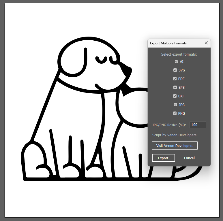 [filename]_export folderexport_multiple_formats.jsx) to your Illustrator scripts folder:C:\Program Files\Adobe\Adobe Illustrator [Version]\Presets\en_US\Scripts/Applications/Adobe Illustrator [Version]/Presets/en_US/Scripts.jsx extension.File > Scripts > export_multiple_formats to run the script.[filename]_export folder in the same directory as your source file (e.g., for myfile.ai, files are saved in myfile_export/).