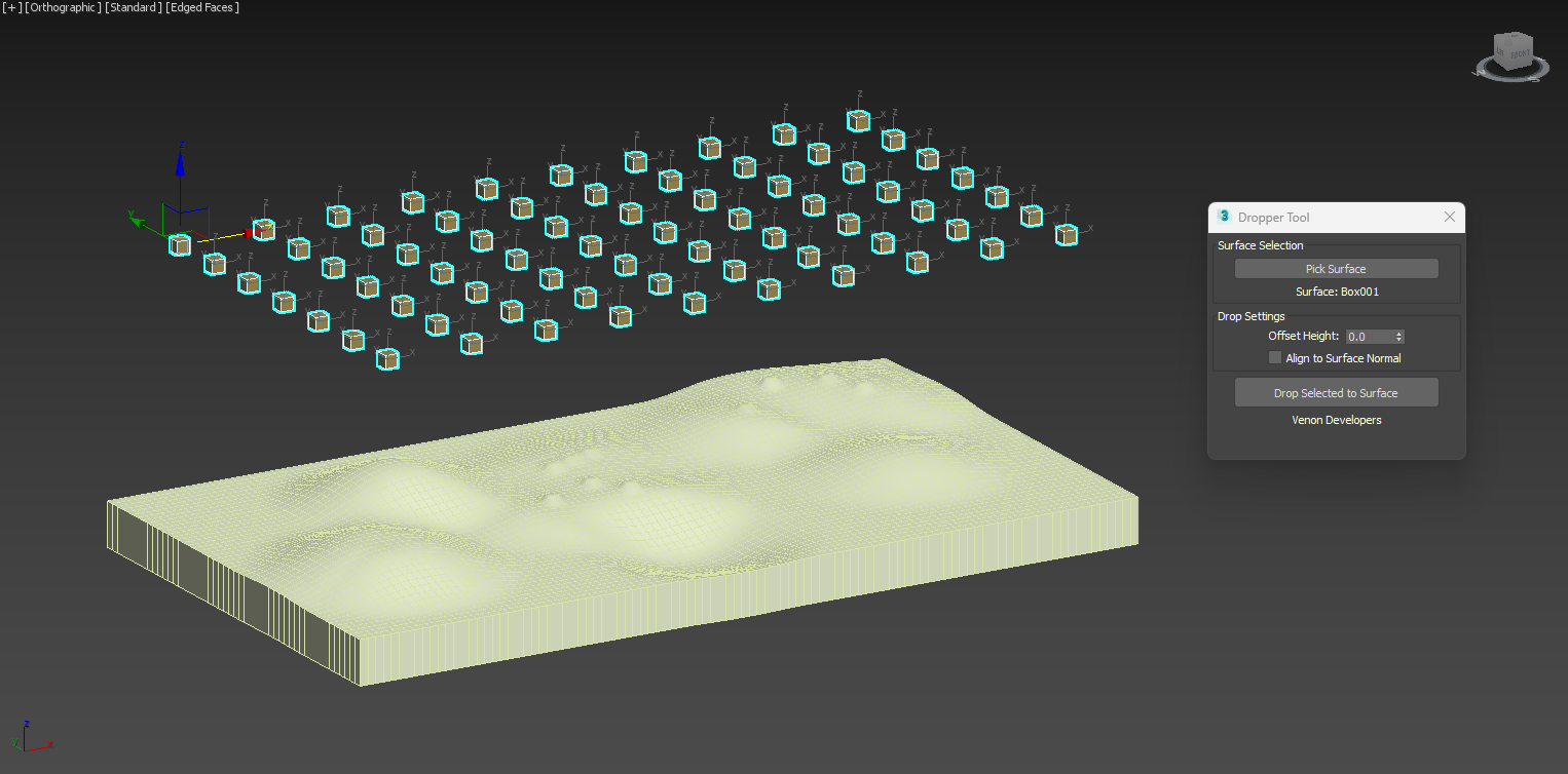 Click the Drop Selected to Surface button. The script will cast rays downwards from each selected object's pivot and move it onto the surface with the specified offset and alignment settings.
