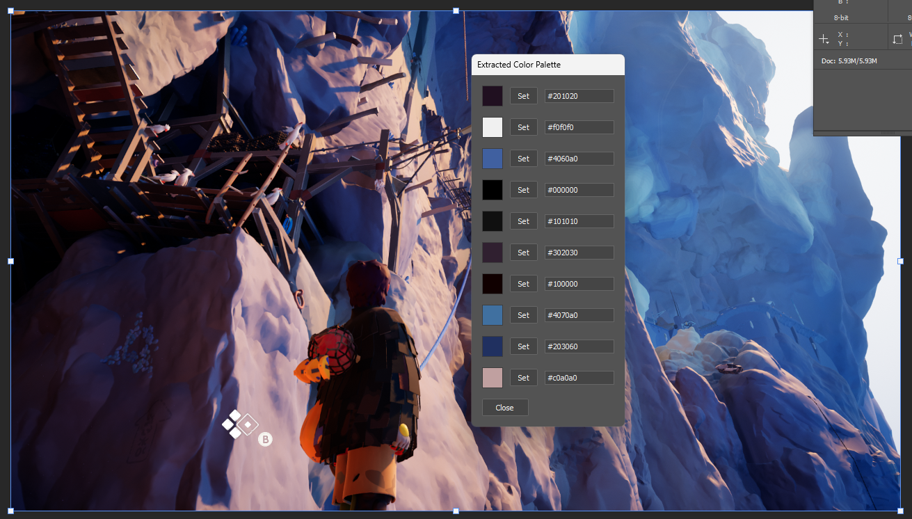 This Photoshop script extracts dominant colors from the active image and displays them in a modal dialog window. Each extracted color is shown as a color swatch with its hex code and a "Set" button that lets you immediately set Photoshop’s foreground color to the selected color.