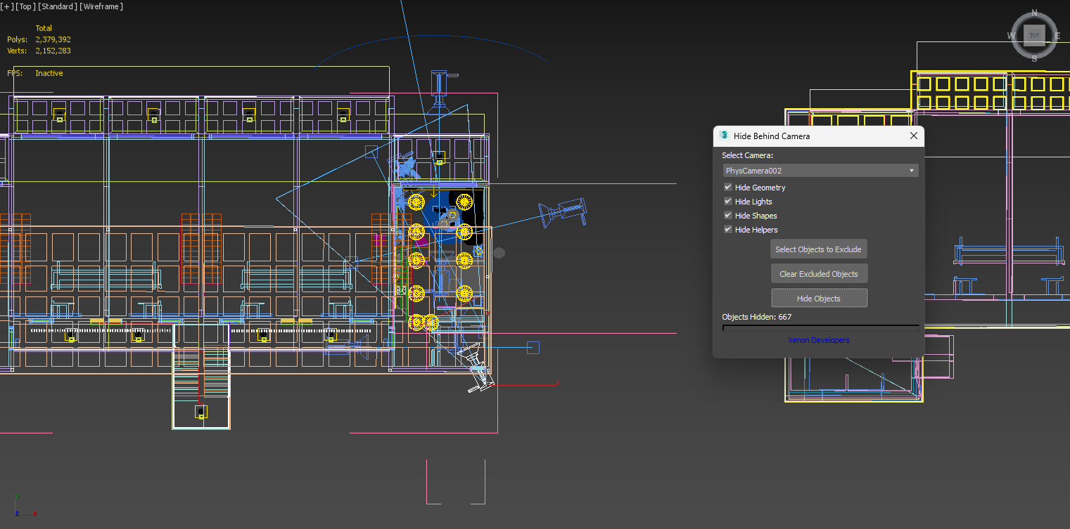 Hide Behind Camera is a utility script for Autodesk 3ds Max that allows you to quickly hide objects that are entirely behind the selected camera or within its near clipping distance. This is especially useful for optimizing your scenes, cleaning up clutter, or improving rendering performance.