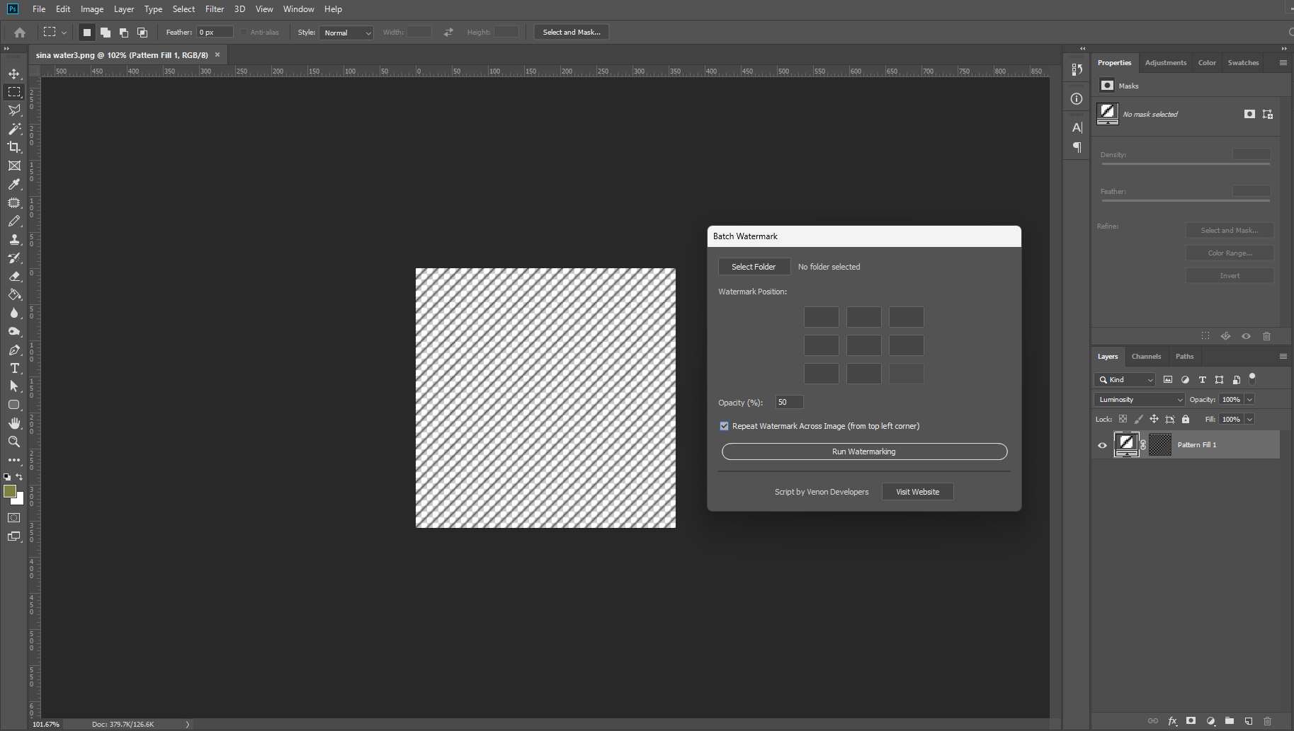 This script adds a watermark to all images in a selected folder, either placing it at a chosen position or repeating it seamlessly across the entire image like a pattern.