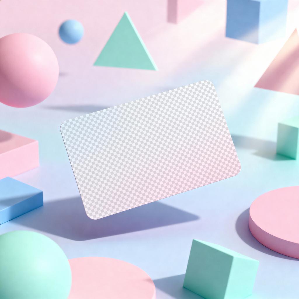 This high-resolution 4K PSD mockup file presents a playful and modern scene with a blank rounded-corner business card floating elegantly amid a vibrant arrangement of pastel-colored geometric shapes—spheres, cubes, cylinders, cones, and triangles in soft pinks, blues, and mints—set against a smooth gradient background with subtle shadows and highlights for a dreamy, contemporary feel.