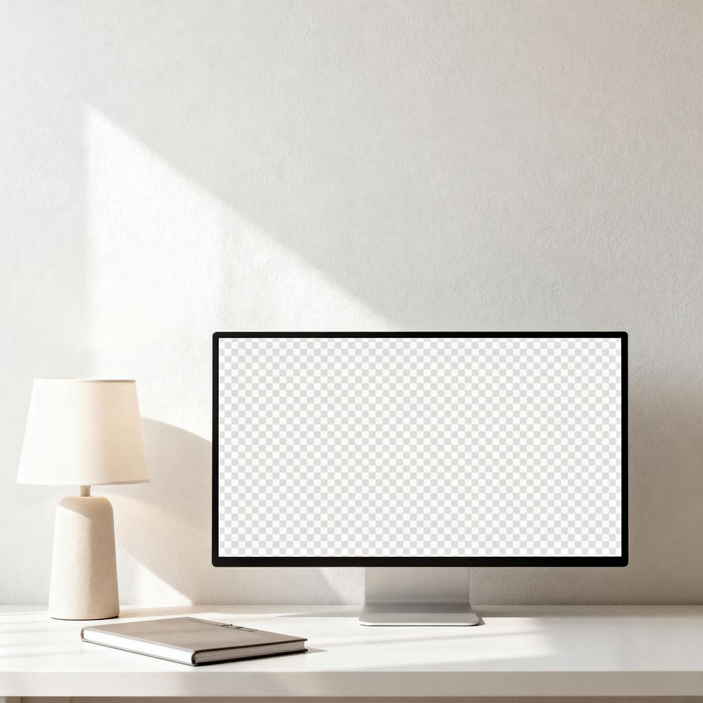 This high-resolution 4K PSD mockup file depicts a sleek, modern desktop computer monitor placed on a clean white desk in a minimalist workspace, accompanied by a stylish ceramic table lamp and a closed notebook, all illuminated by soft natural sunlight streaming across a textured white wall for a calm, professional, and contemporary aesthetic.