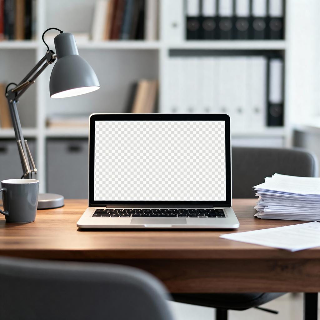 This high-resolution 4K PSD mockup file showcases a sleek MacBook Pro laptop open on a warm wooden desk in a contemporary office environment, thoughtfully composed with a modern gray desk lamp casting soft light, a matching coffee mug, stacks of papers, and blurred bookshelves in the background for a realistic, productive workspace vibe.