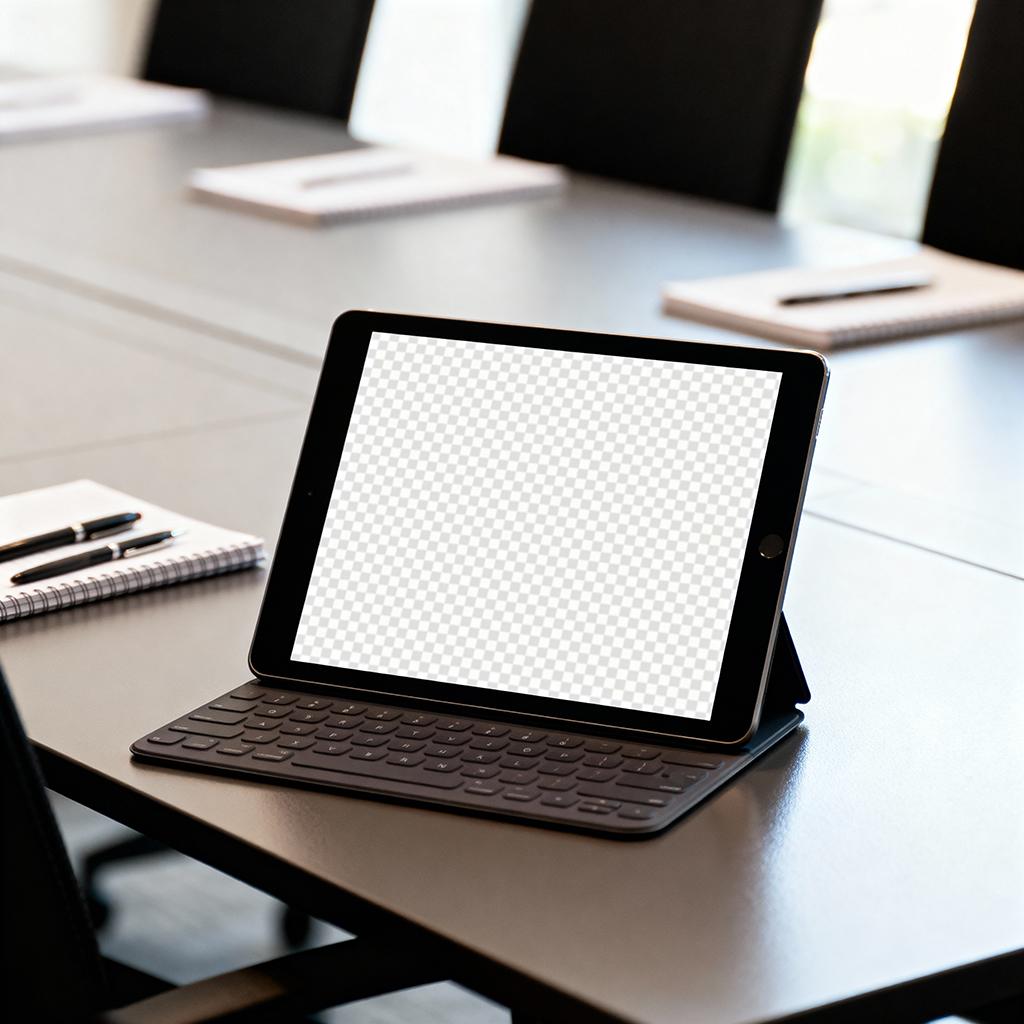This high-resolution 4K PSD mockup file features a sleek iPad Pro with an attached Smart Keyboard placed on a modern conference room table, surrounded by notebooks, pens, and blurred office chairs in the background, all bathed in soft natural light from large windows for a professional, productive, and realistic business environment that highlights mobile productivity.